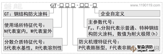 GT-WRF-Ft1.50-B,表示:室外用溶劑性非膨脹型特種鋼結構防火涂料,耐火性能為Ft1.50,耐火極限1.5h,B為企業(yè)自定義代號。