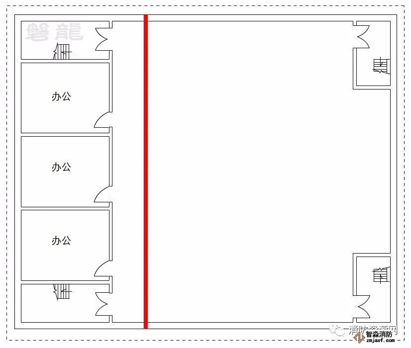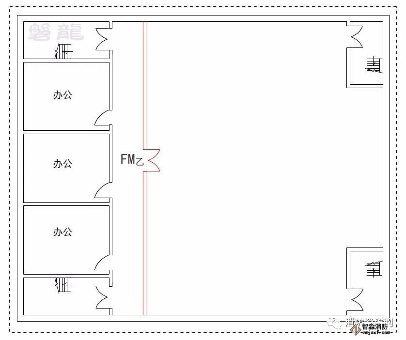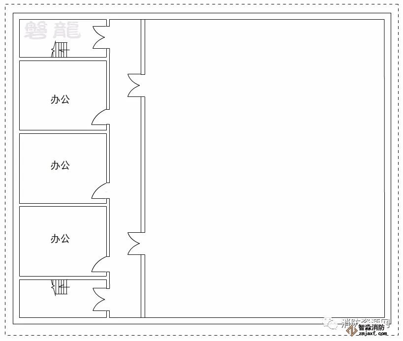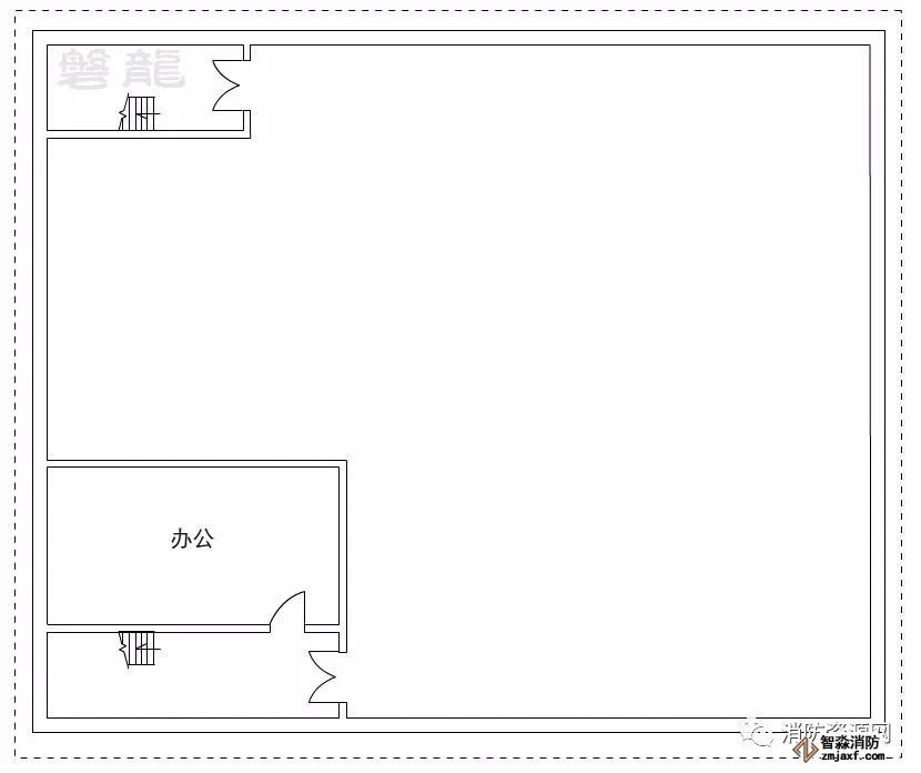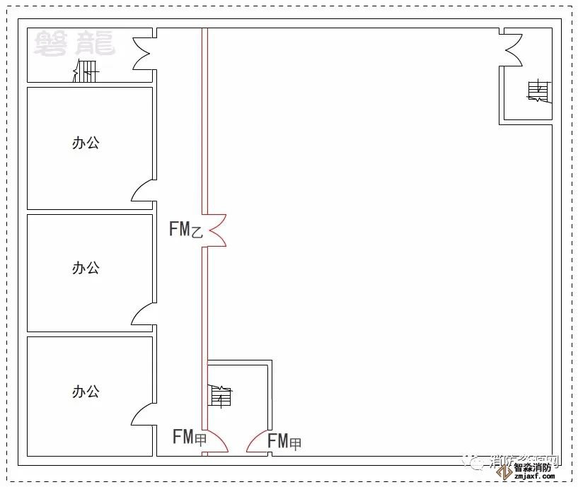 注:圖示2中,對于辦公室(休息室)部分,當滿足《建規》5.5.8設置1部疏散樓梯的條件時,可只設置一部疏散樓梯(或一個安全出口)。